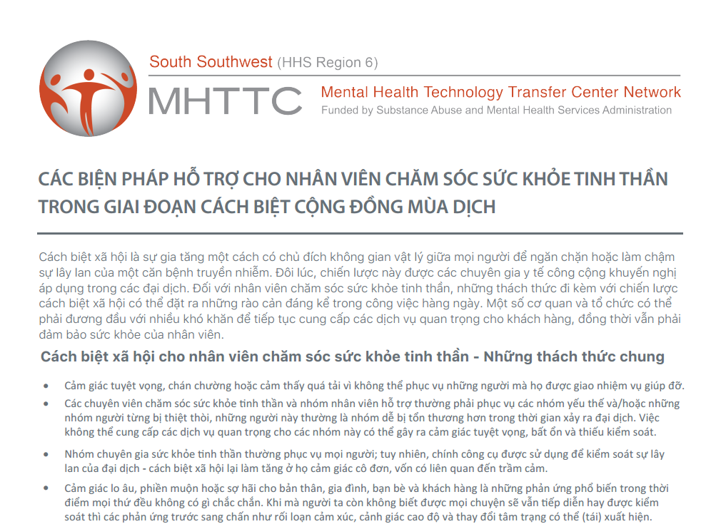 Các biện pháp hỗ trợ cho nhân viên chăm sóc sức khỏe tinh thần trong giai đoạn cách biệt cộng đồng mùa dịch